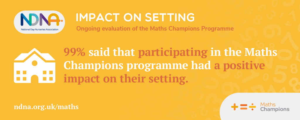 “The difference the Maths Champions Programme has made for our setting, our team and the children has been fantastic. Our confidence in teaching maths has grown and we’ve worked together to create a really maths-rich environment.